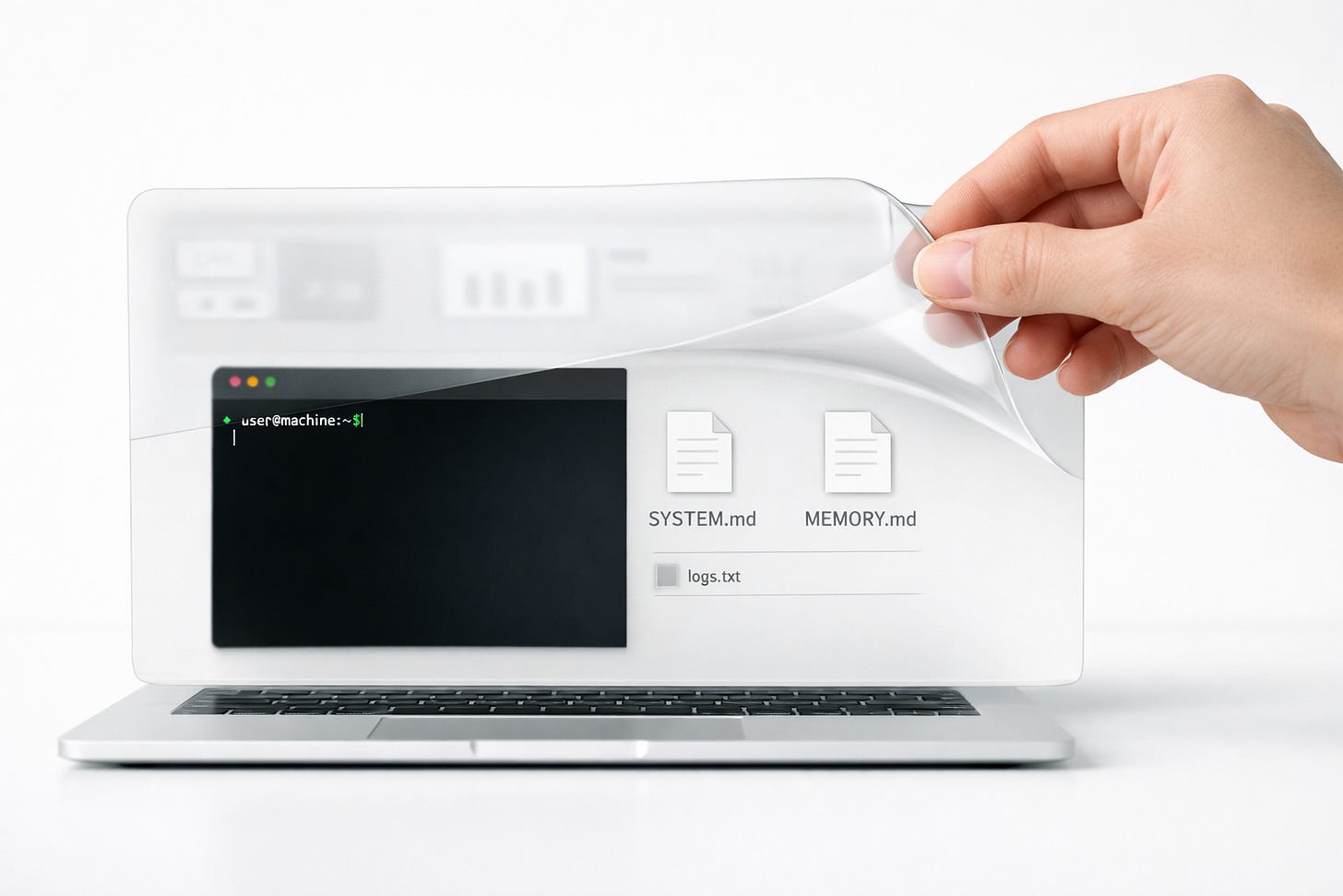 A file called SYSTEM.md. A file called MEMORY.md. A shell the agent could execute against. A heartbeat that woke it up without being asked. Markdown files describing what it could do. Logs of what it had done.